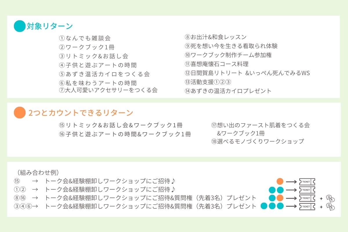 ・体験型のリターンは、このプロジェクトに共感し、子育てママ達のチカラになりたいとご協力下さった方達です。ここでしか受けられない 内容ばかりです。