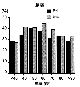 各世代の腰痛を訴えている方の割合をグラフにしたものが見つかりました。