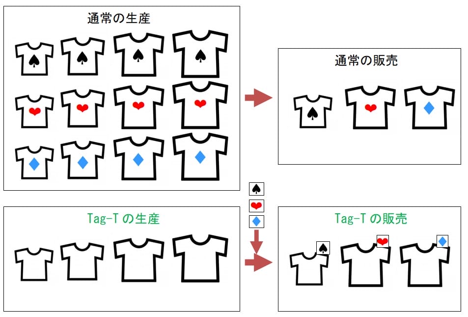 通常の生産では(デザインの数)x(サイズ種類)の生産が必要です。しかしTag-Tではデザインが別パーツなので(サイズ種類)の生産だけで済み、在庫も少なく、売れ残ったデザインのTシャツを廃棄するという事もありません。