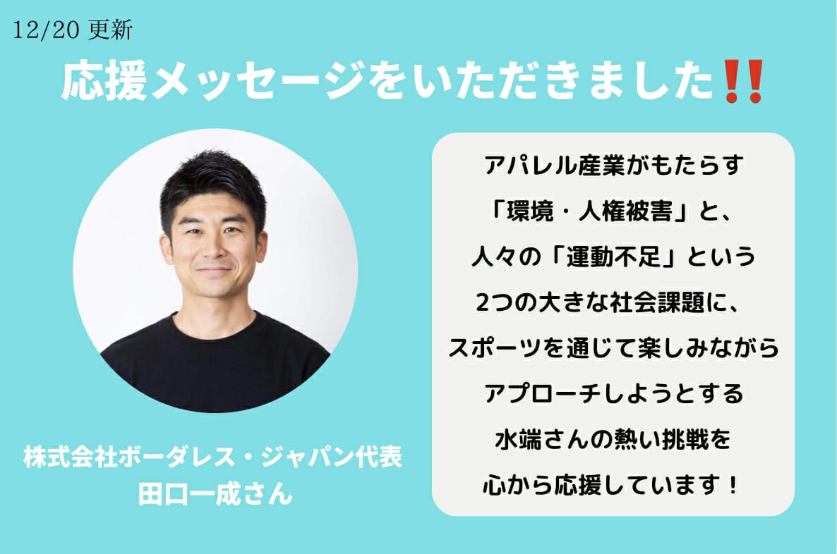 当サイト『For Good』を運営されている株式会社ボーダレス・ジャパン代表の田口一成さんより応援メッセージをいただきました!2年ほど前に社会を本気で変えようと様々な挑戦をされている田口さんを知り、その際に感銘を受け、今回このサイトでクラファンをしようと決断しました!