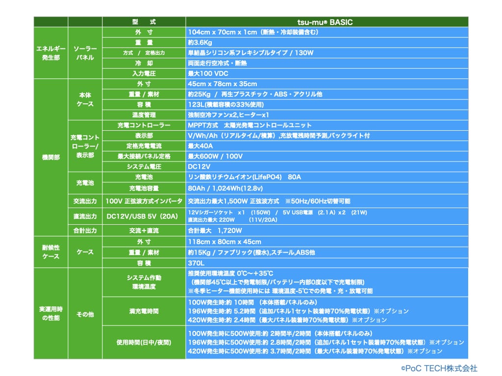 ”tsu-mu“は、自然の太陽光を活用した、自律型マイクログリーンエネルギーユニット。 100%カーボンフリーな自然太陽光から電気を作り、蓄え、どこでも電気製品を使うことが可能な自家発電ユニットです。もちろん設置する時や使う時に、特別な工事や電気知識はいりません。ただつんだり、置いておくだけです。