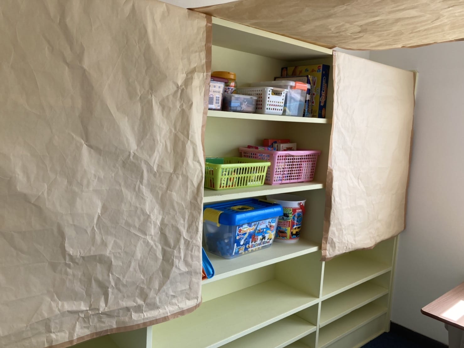 大きな模造紙で目隠しをしています。