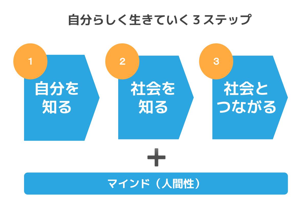 つまり、このように3つのステップ(自分を知る、社会を知る、社会と繋がる)を経験することで