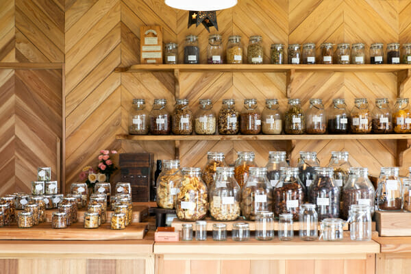 店舗ではワンウェイゴミ(使い捨てのゴミ)の削減を目指し「GO ZERO WASATE STORE」として、お客様にご協力いただきながら、ドライフルーツやナッツ、自家製の焼き菓子などの量り売り、自然酵母を使用した焼きたての酵母ブレッドなどの販売をしています。