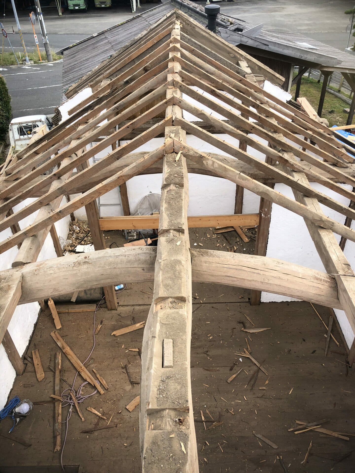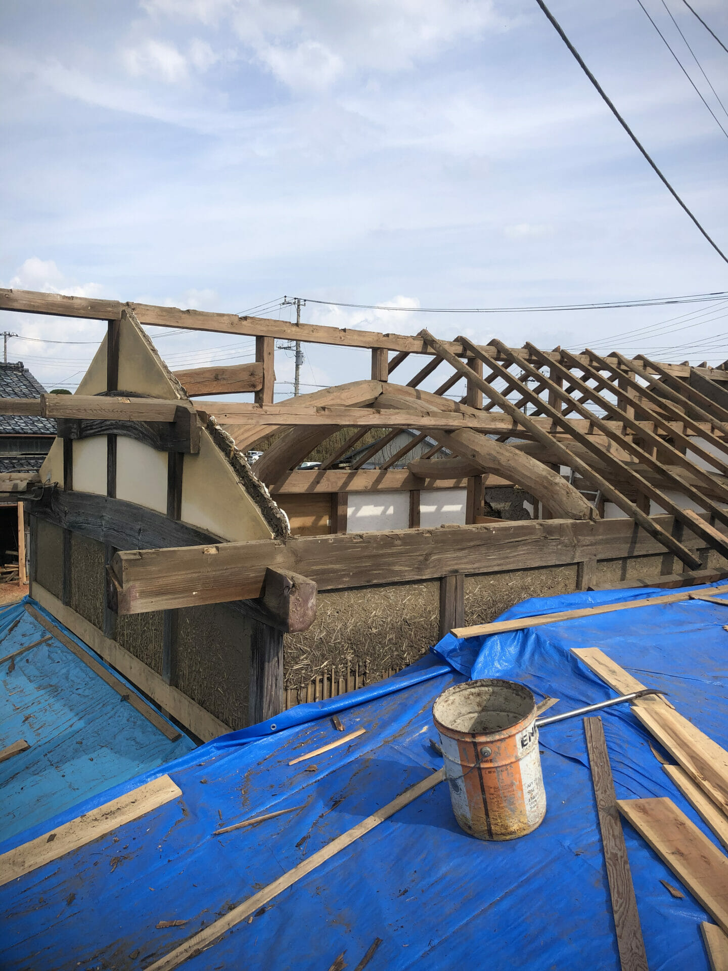 左官工事は「宮下左官」の宮下空氏が担います。左官技術を用いて、昔ながらの竹木舞下地の漆喰仕上げ壁と木材などの自然素材を組合せる事で、安易に全てを建て直すことはせずに、既存の躯体を活かしつつ、内部結露防止及び防カビ効果を持つ壁となる様に機能を付加します。