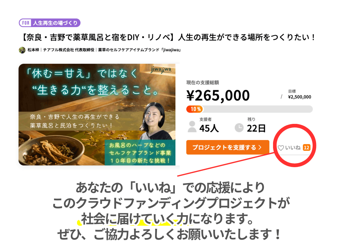 吉野に作る古民家の宿と薬草風呂は、社会のリズムで疲れた心身を回復させる「癒やし」の場所です。 しかしそれだけでなく、ご縁があって関わってくださるあなたの「恐れ」や「心配」に向き合い、人生を前に進めていくための「鼓舞するプログラム」も一緒にお届けしていきたいと強く思っています。