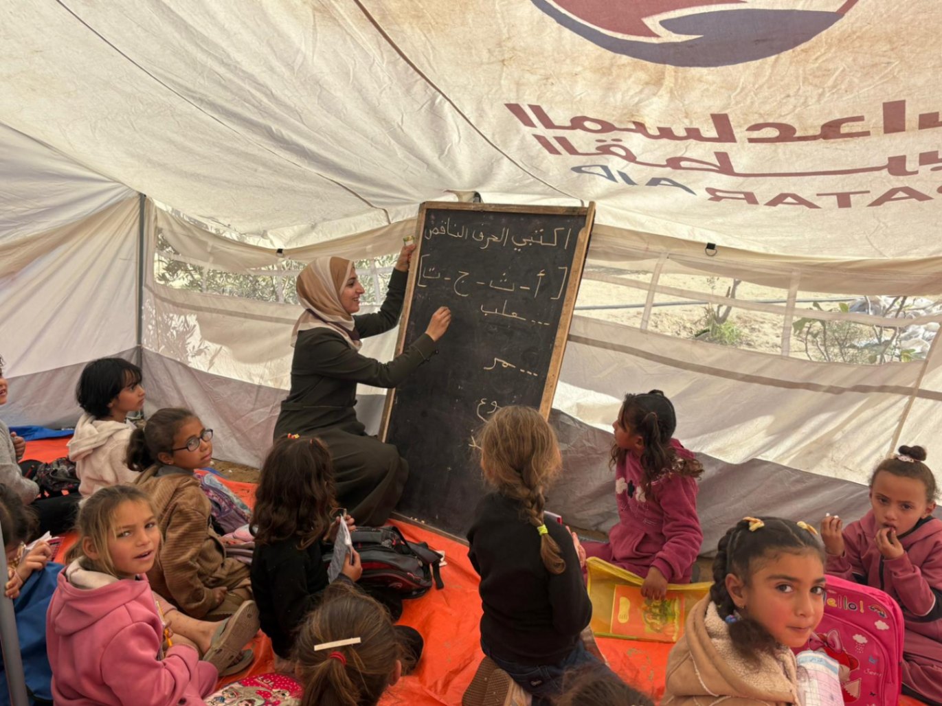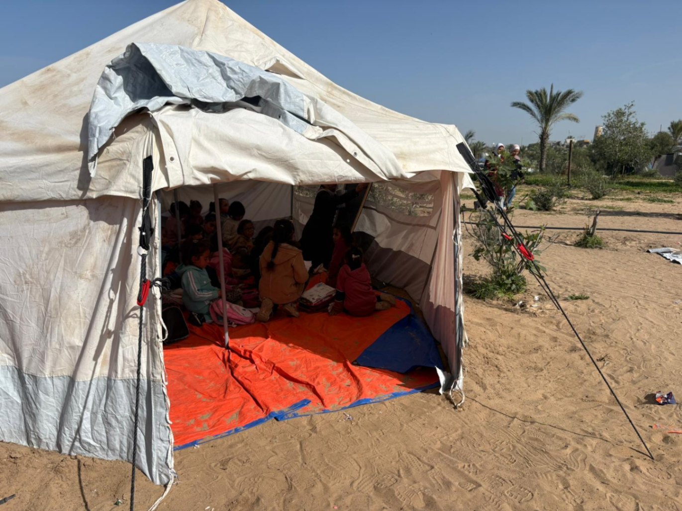 アマルさんが訪ねた、ハーンユニスに新しくできたTLS(仮設学習スペース)には、古いテントで作られた7つの教室があります。