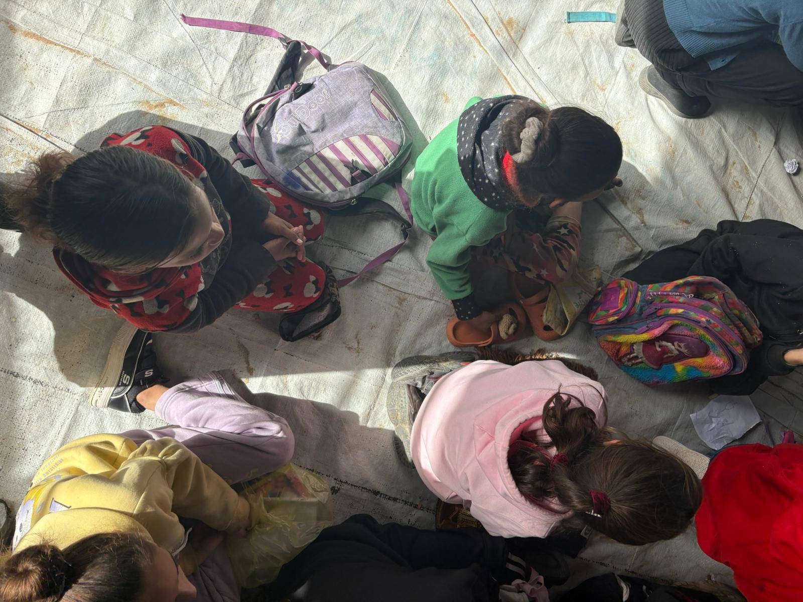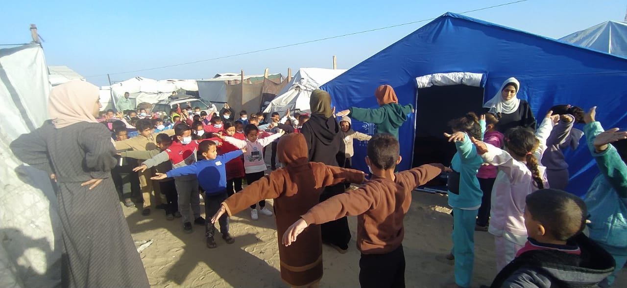 【カレッドさんが運営する仮設テントの学習スペースで体を動かす子どもたち】