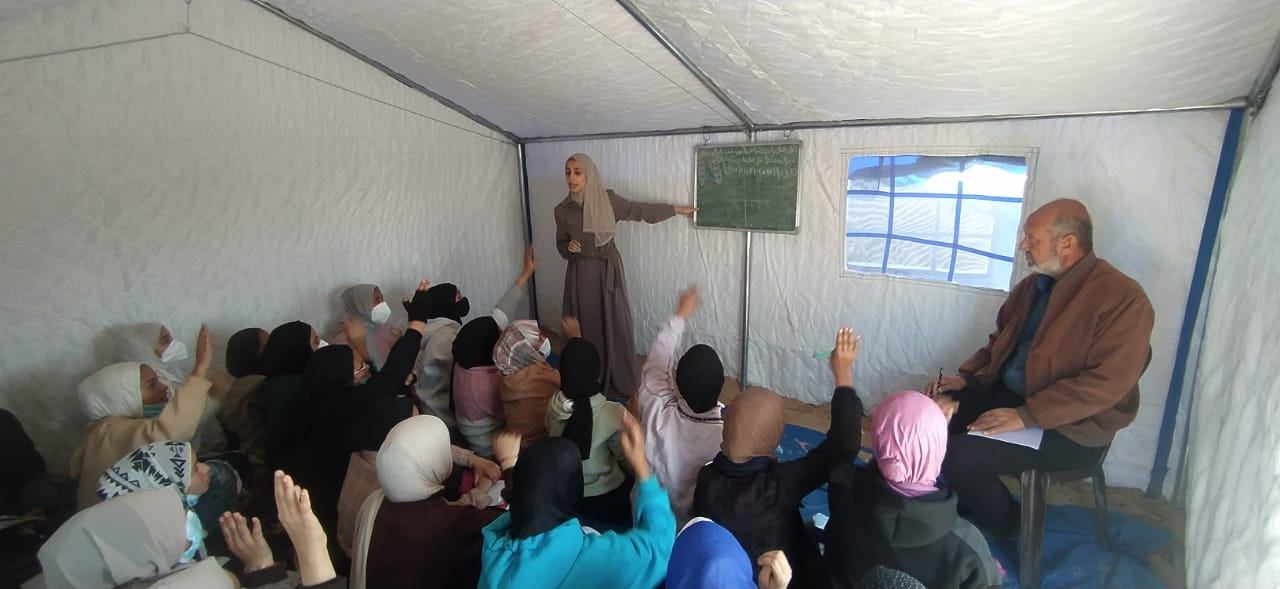 しかし、テントが新しくなった現在も、停戦合意後のTLSへ通う子どもたちが増えたことにより、学習スペースは依然として限られています。今は、一つのテントに35~40人の生徒が通っており、椅子や机はありません。このようなテントを、3シフト制の学校として使っています。具体的には、1日を、朝の1.5時間、午前の1.5時間、午後の1.5時間という3つの時間帯に分け、の1つのシフトごとに同じ学年の子どもたちが通って授業を受ける仕組みです。こうすることで、一人の子どもは平均して週に3日、カレッドさんのTLSに通っているとのことです。