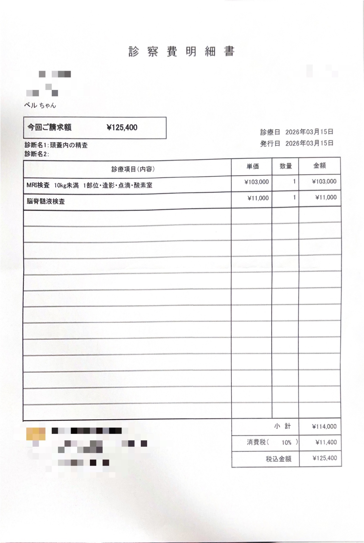 今回のMRI検査・麻酔・脳脊髄液採取および関連検査費用は合計で145,200円でした。