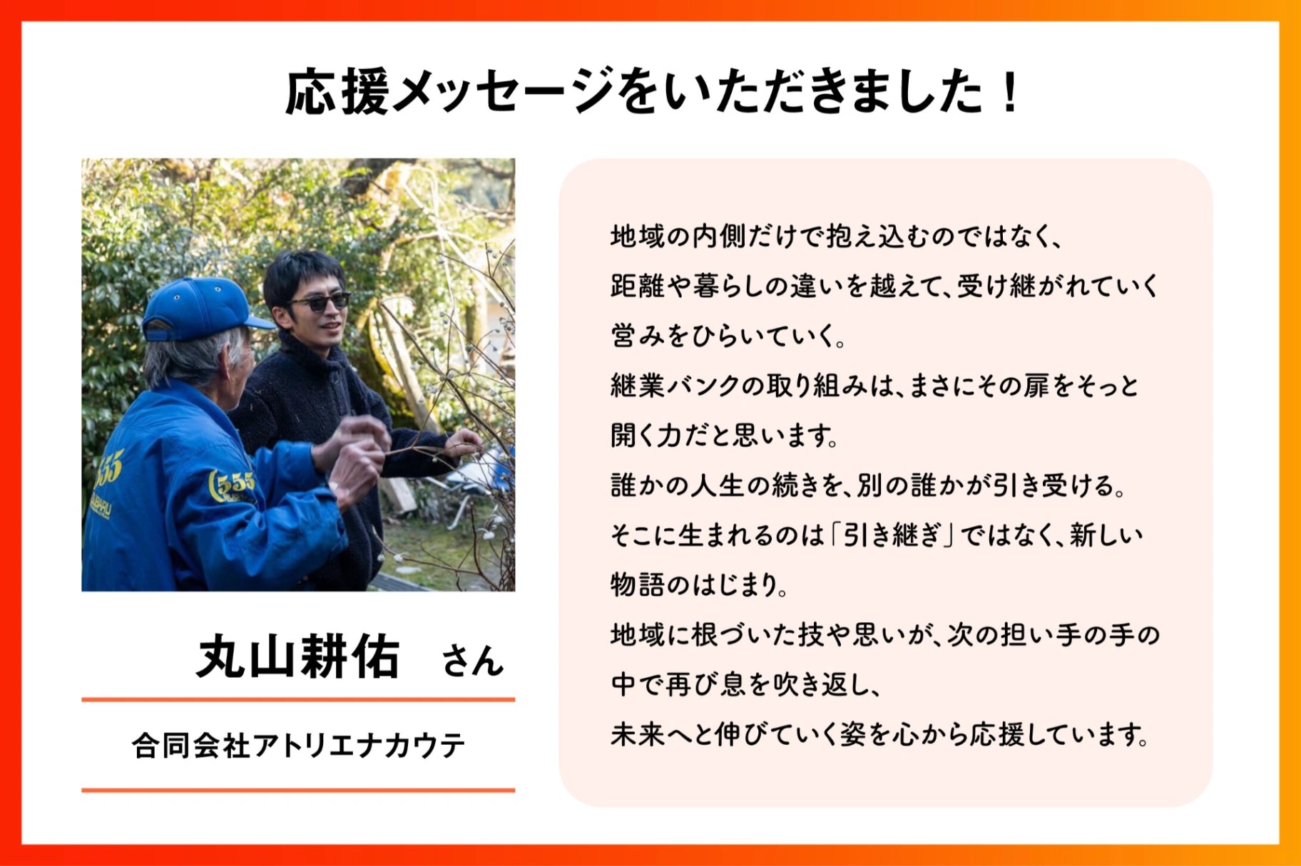 \応援メッセージのご紹介/”合同会社アトリエナカウテ 丸山耕佑さん”から応援メッセージをいただきました。⋯⋯⋯⋯⋯地域の内側だけで抱え込むのではなく、距離や暮らしの違いを越えて、受け継がれていく営みをひら...