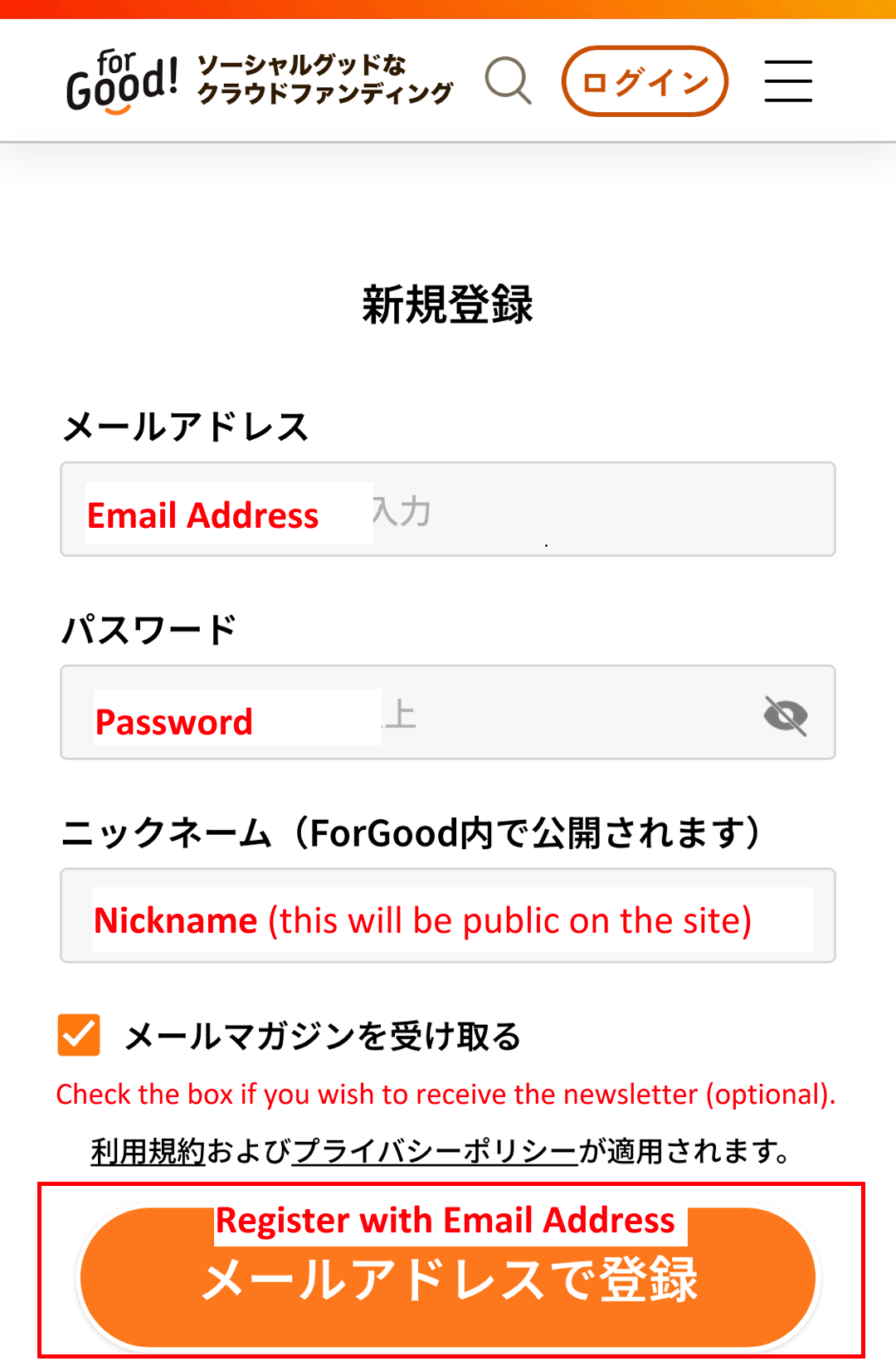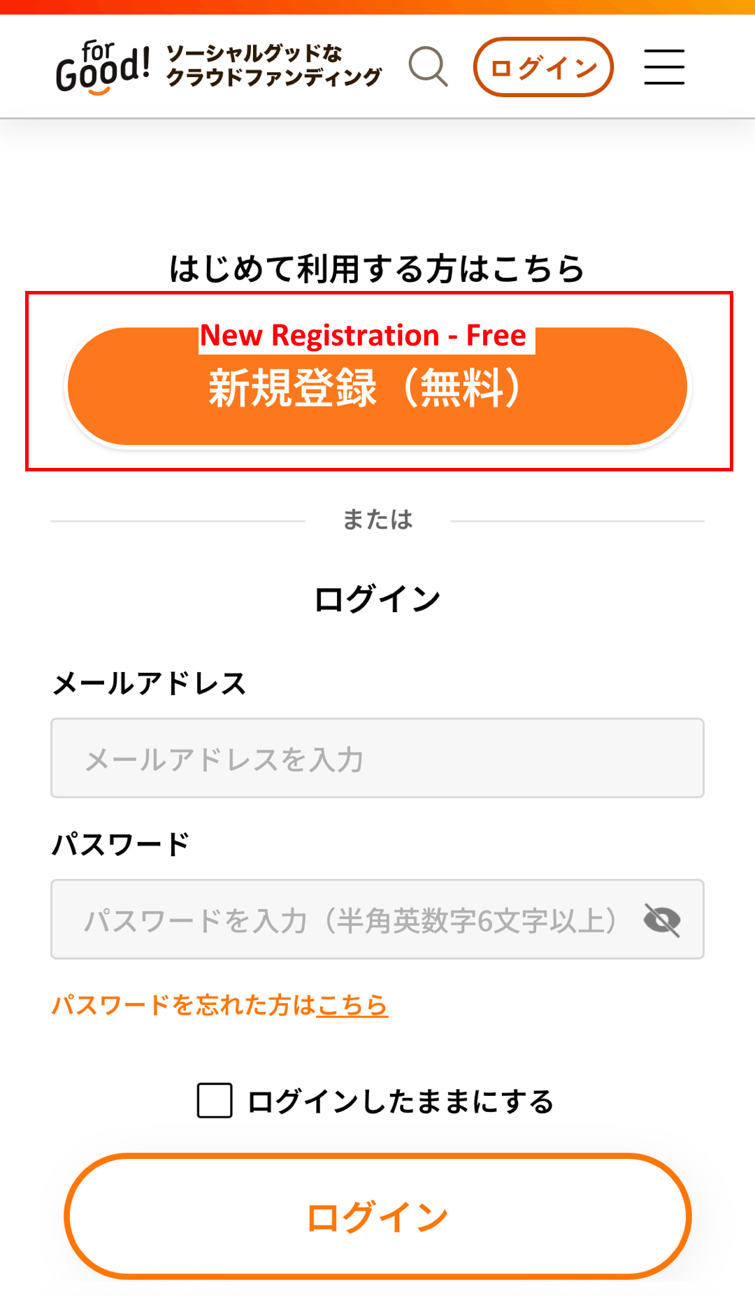 If you are new to the site: Click the large orange button 新規登録(無料) (New Registration - Free). Fill in your information. Click the orange button メールアドレスで登録 (Register with Email Address).