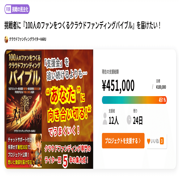 挑戦者に『100人のファンをつくるクラウドファンディングバイブル』を届けたい!