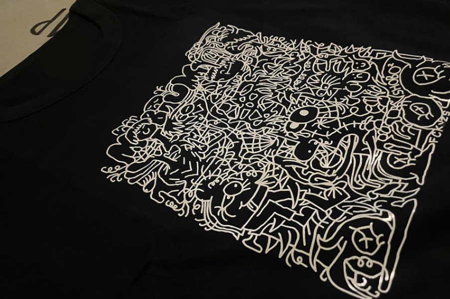 リターン品のTシャツのテストサンプルができました。発注はまだ先ですが、実際にツアー中にサンプルを見てもらうために1点ものをつくりました。これはラバー転写で作ったので、実際にはシルク印刷で、印刷面のサ...