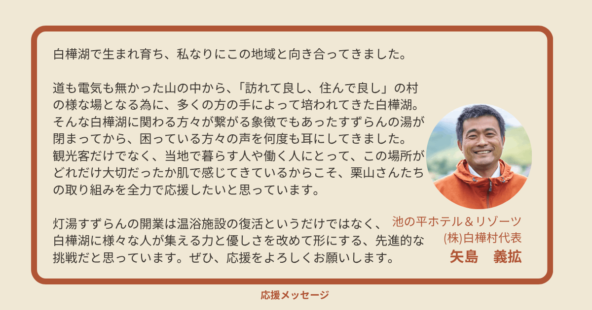 灯湯(あかりゆ):白樺湖に、もう一度「帰ってこれる灯り」をともす
