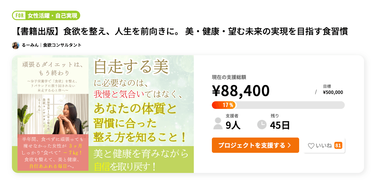 でも、いざプロジェクトが公開になると、支援してくださった方々・応援してくれている方々が個別にLINEやDMで「応援してるよ!」「本、楽しみにしてるね!」とメッセージをくださりました。そして、現在、プロジェクトページには81人もの方が「いいね」を押して応援してくれています。