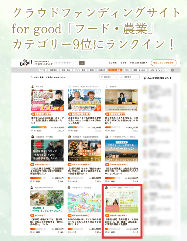 そして!朝からめちゃくちゃ驚いたのですが、クラウドファンディングサイトfor goodの「フード・農業」カテゴリーで9位にランクインさせていただいています。