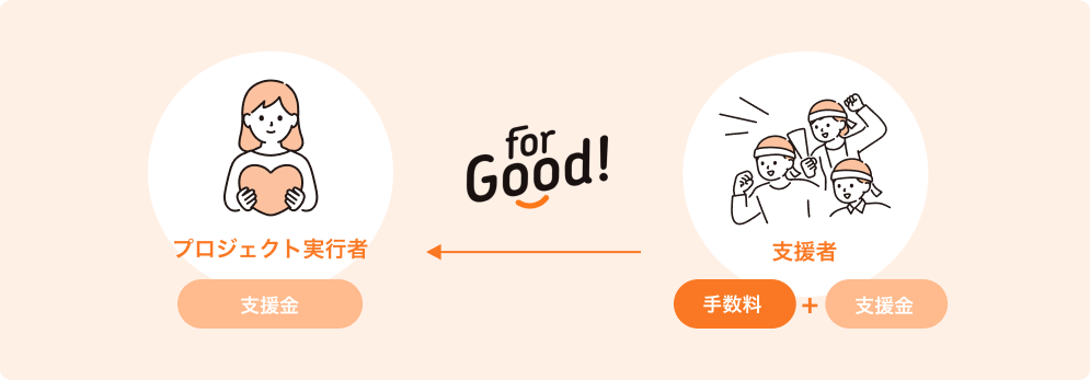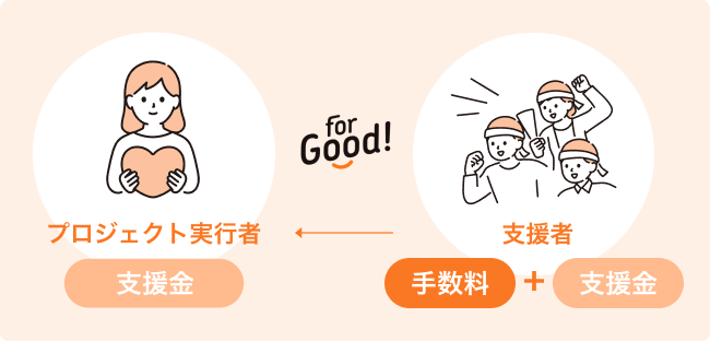 そこでFor Goodでは、プロジェクト実行者が支援金を全額受け取ることができるよう、システム運営にかかる手数料を支援者の方々に少しずつ支えていただく仕組みで運営しています。